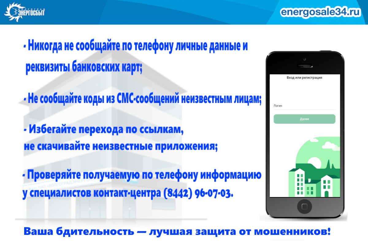 • Для передачи показаний, оплаты и других функций удаленных сервисов ПАО «Волгоградэнергосбыт» используется мобильное приложение компании, которое можно скачать самостоятельно из официальных магазинов мобильных приложений, а не по указаниям звонящих незнакомцев.