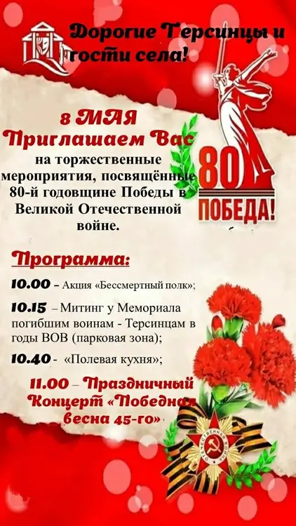 В честь этой знаменательной даты в нашем селе 8 мая пройдут праздничные мероприятия. Мы приглашаем каждого из вас присоединиться к нам, чтобы вместе вспомнить, почтить и отпраздновать!