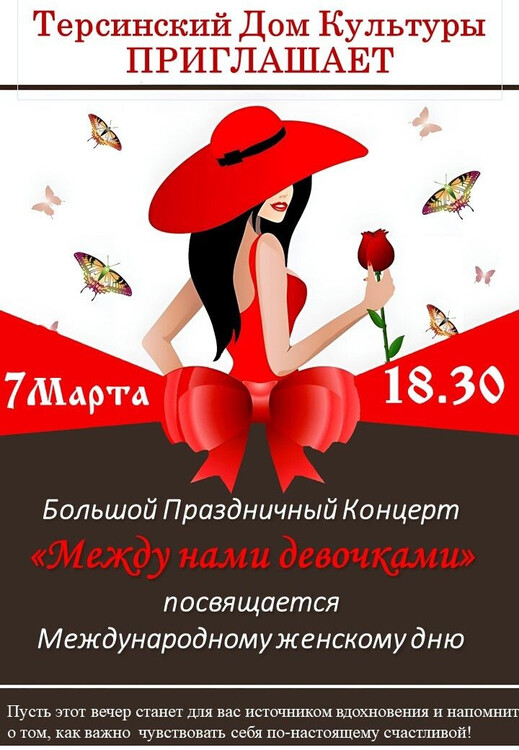 7 марта в 18.30 Терсинский Дом Культуры приглашает вас на Большой Праздничный концерт «Между нами девочками». Пусть этот вечер станет для вас источником вдохновения, подарит силы и напомнит о том, как важно сиять и чувствовать себя по-настоящему счастливой. Дарите любовь, дарите заботу, дарите незабываемые эмоции! Будьте счастливы всегда!