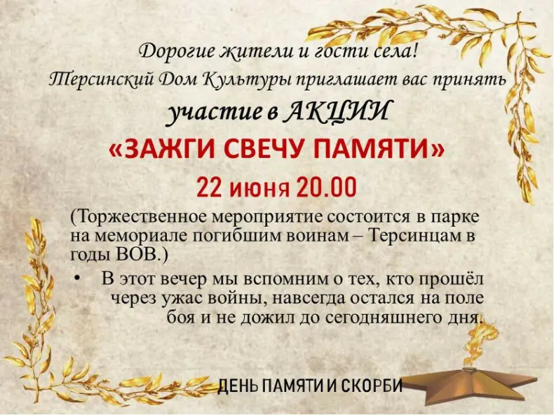 Терсинский Дом Культуры Приглашает всех жителей и гостей села принять участие в АКЦИИ «Свеча памяти», приуроченной ко Дню памяти и скорби — годовщине начала Великой Отечественной войны.