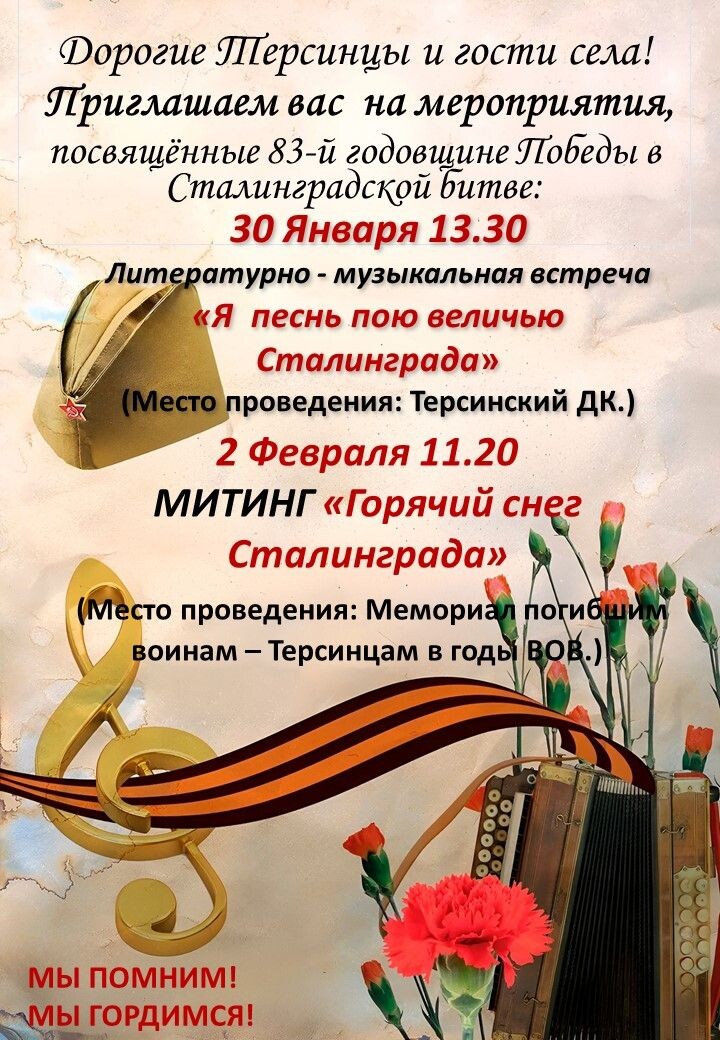 Уважаемые Терсинцы! Приглашаем вас принять участие в мероприятиях ко Дню Победы в Сталинградской битве!